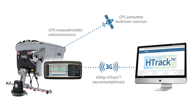 Tämä levitin on yhteensopiva HTrack™-seurantaohjelmiston kanssa. Ohjelma näyttää käsittelyreitti- ja levitystiedot kartalla reaaliajassa tai säännöllisin aikavälein. Levitysreittitiedot, kuten nopeus, GPS-sijainti ja käytettävä materiaali voidaan koota yhteenvedoksi ja niistä voidaan luoda PDF-raportteja.